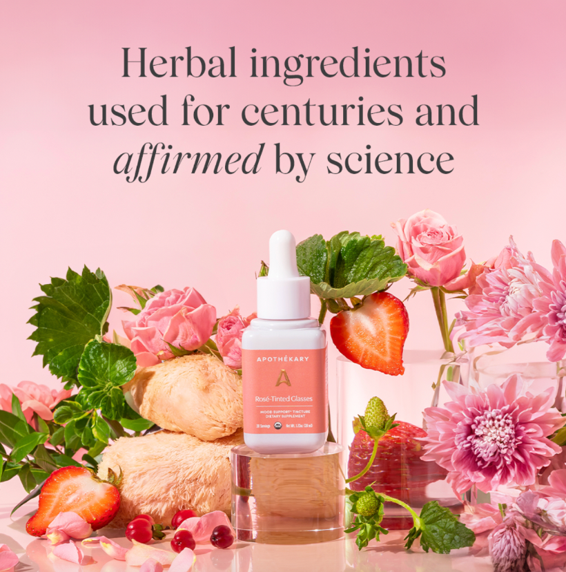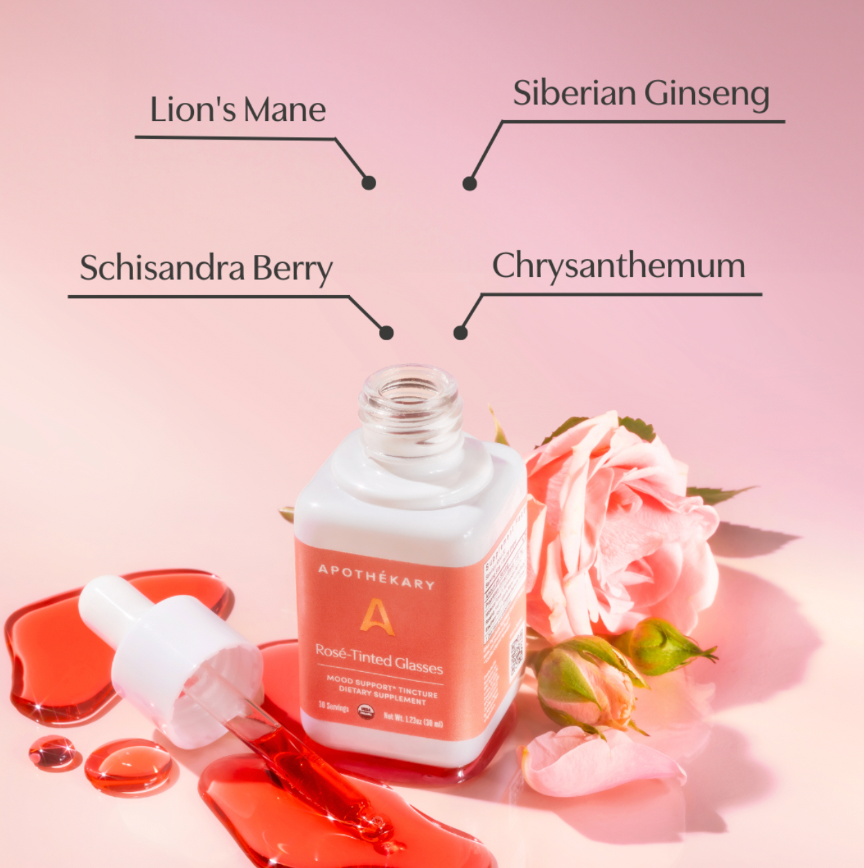 Apothékary’s Rosé-Tinted Glasses™ is a clinical herbalist-crafted, non-alcoholic rosé wine alternative designed to support mood, skin, and stress relief.