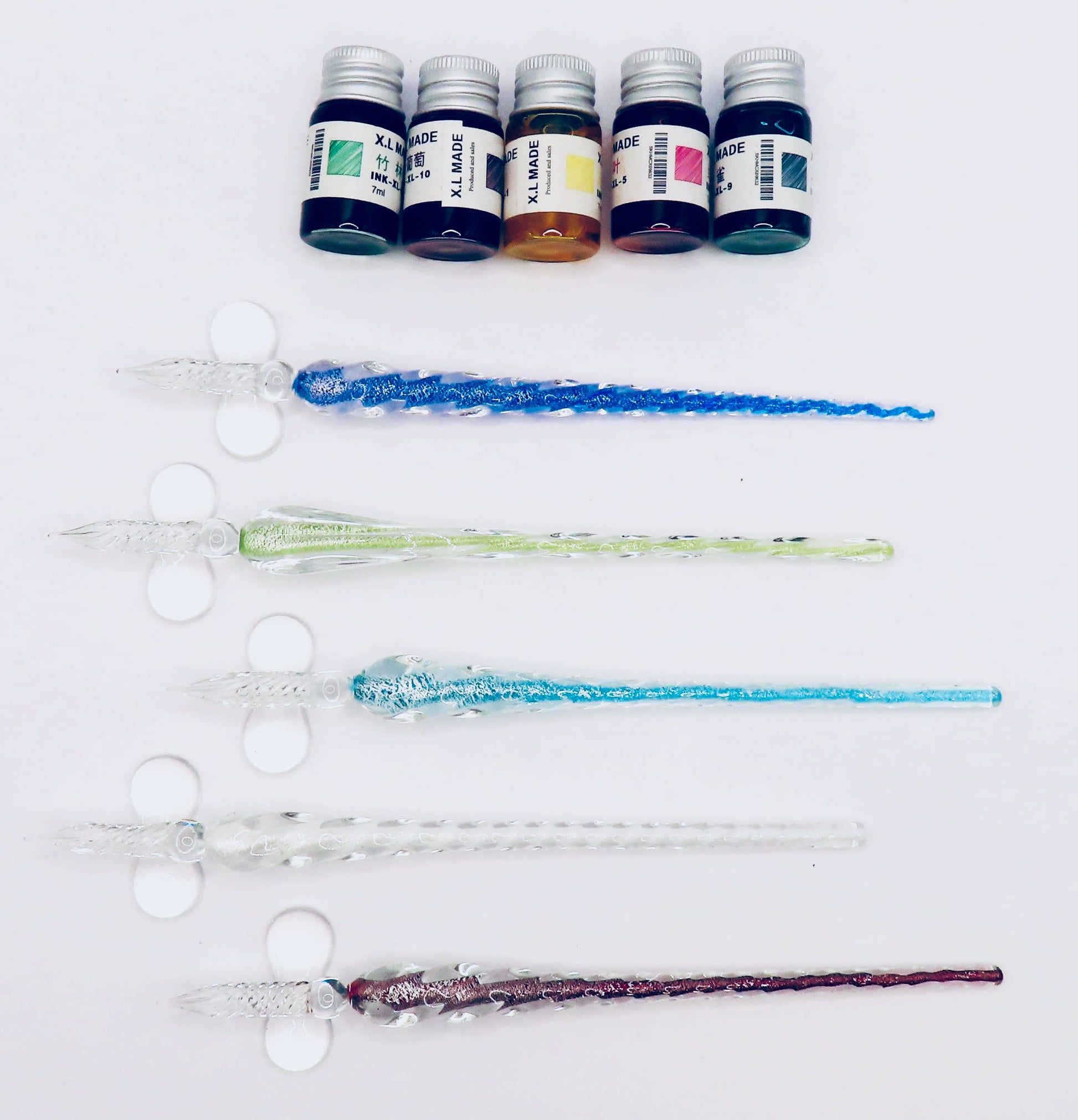 These hand-blown foil glass dip pens are designed to make calligraphy simple and enjoyable. The tip features deep grooves that hold ink, allowing smooth, consistent writing with just a quick dip. Each set includes a protective black gift box with foam, a glass pillow to rest your pen, and a small bottle of ink. Available in white, burgundy, blue, purple, and lime, these pens offer a beautiful and practical way to enhance your writing experience.